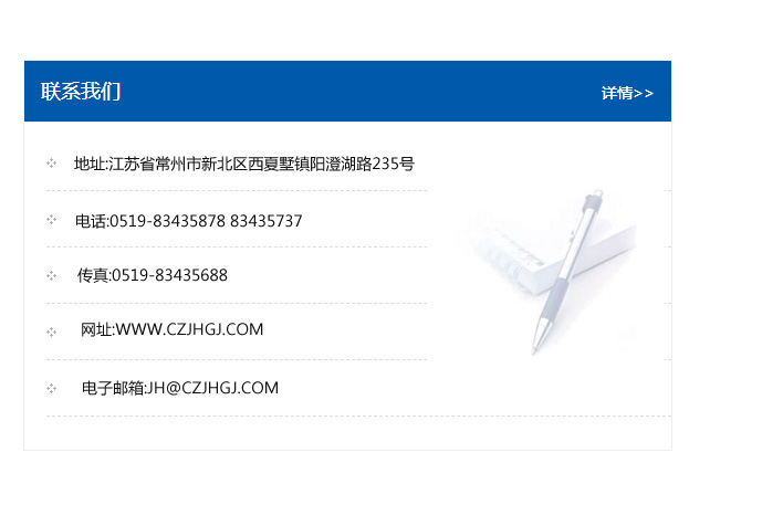 地址:常州市新北區(qū)友邦商務(wù)大廈1幢16、17層  電話:0519-85101652  傳真:0519-85112595  郵編:213022  網(wǎng)址:www.cz-jiayue_cn.chiktat.com  郵箱:xiajifengaa@163.com